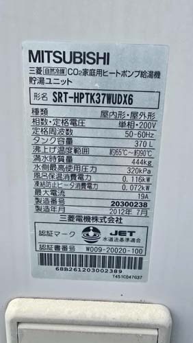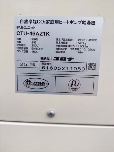 須崎市若葉町 三菱電機自然冷媒CO2家庭用ヒートポンプ給湯機 貯湯ユニットSRT-HPTK37WUDX6→コロナ自然冷媒CO2家庭用ヒートポンプ給湯機 ヒートポンプユニットCHP-DZ601K、貯湯ユニットCTU-46AZ1K エコキュート交換工事