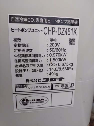 土佐市旭町 コロナ自然冷媒CO2家庭用ヒートポンプ給湯機 ヒートポンプユニットCHP-DZ451K エコキュート交換工事