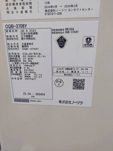 いの町小川東津賀才 ノーリツ石油小形給湯機OQB-3706Y 給湯器交換工事