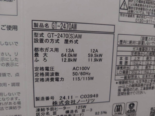 いの町桑瀬 ノーリツ給湯器GT-2470AW 給湯器交換工事